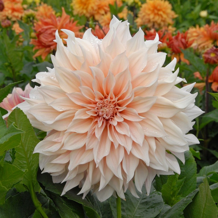 Саженцы и рассада георгина декоративного Кафе о Лэ (Dahlia cultorum) сделают сад более роскошным, наполнив его элегантными цветами, которые имеют классический цвет кремового латте с большим количеством молока. Окрашивание цветка распределяется от более темной, почти коричневой середины до светлых кончиков. Лепестки у сердцевины в 3-4 раза меньше нижних. Волнистые, язычками загнуты внутрь. Несмотря на деликатность расцветки, долго сохраняют прекрасный вид после среза. Размер цветка огромный, но можно достичь еще более крупных размеров при удалении боковых бутонов.