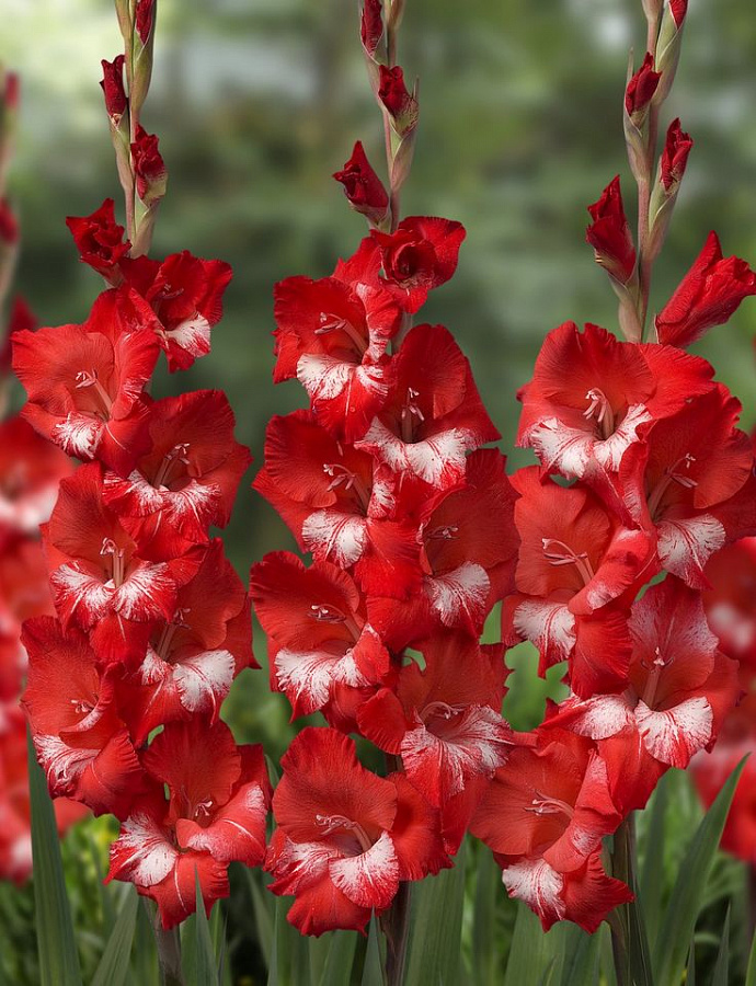 Гладиолус крупноцветковый "Алгарве" - это великолепное растение с красивыми крупными цветками, окрашенными в яркий красный цвет с белой серединой. Его стебель достигает высоты от 80 до 110 см, что делает его заметным акцентом в любом саду. Листья гладиолуса имеют стройную форму и придают растению изящный вид.