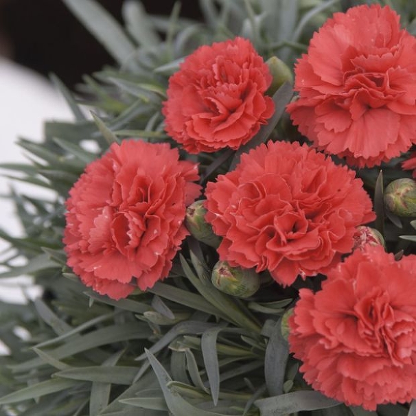 Саженцы Гвоздики Обыкновенной Диана (Diana Dianthus) популярны и среди опытных садоводов, и среди тех, кто только познает тонкости работы с садовыми культурами. Это неприхотливый цветок, который прекрасно выдерживает и высокие, и низкие температуры, может расти на открытых солнечных участках, хорошо отзывается на регулярный полив и терпелив к продолжительной засухе. При этом уже со второго года будет радовать хозяев участка обильным цветением алых бутонов. Цветы крупные, густомахровые, практически полностью покрывают куст. Цветение продолжается в течение месяца, как правило, в июне.