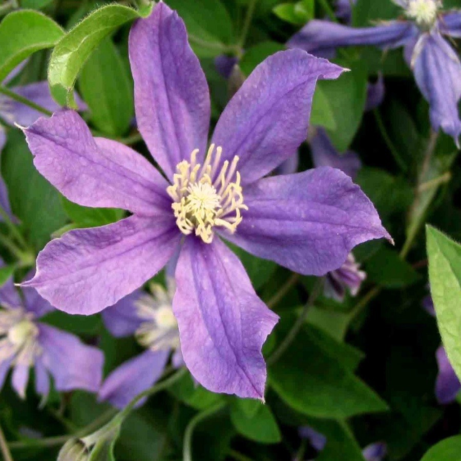 Клематис гибридный Арабелла (Arabella) - лиана, неспособная самостоятельно цепляться за опору. Стебли прямостоячие, не требующие поддержки. Тем не менее, оставленные без опоры, побеги клематиса стелются по земле. Длина побегов достигает 150-200 см. С июня до конца октября растение усыпано фиолетово-голубыми цветками. Диаметр цветка достигает 4-6 см. Саженцы Клематиса Арабелла (Arabella) неприхотливы, растут умеренно, как в открытом грунте, так и в контейнерах, на балконах и террасах. Для выращивания подходит почва богатая питательными веществами с хорошей водопроницаемостью.