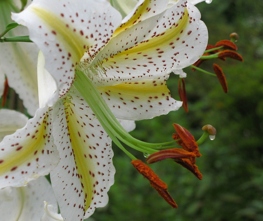 Окраска цветка : крупный, белый, вдоль лепестков широкая ярко-желтая полоса, ярко-оранжевые пыльники и крап по большей поверхности лепестков