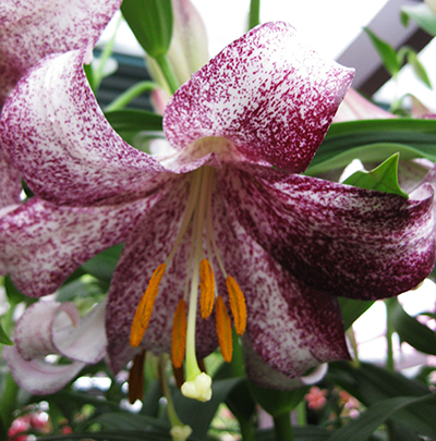 • Окраска цветка : грациозные цветы белоснежного оттенка с густым малиновым крапом по нежным, слегка закрученным лепесткам