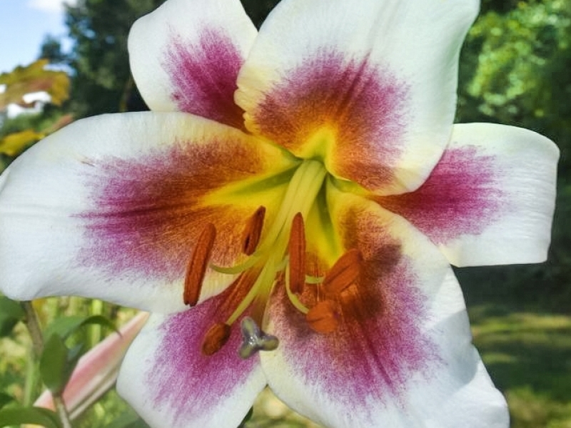 • Окраска цветка : кремово-белый со светло-желтым кантом, бордовыми пыльниками и мазками от центра