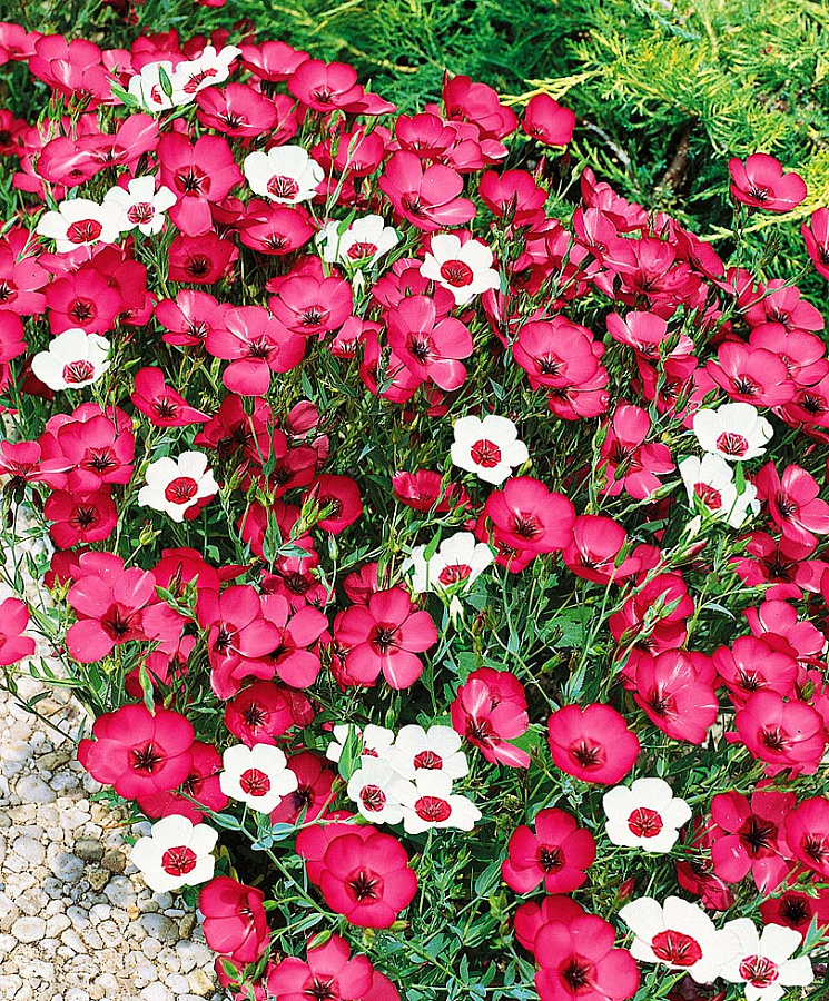Лен крупноцветковый микс - это удивительное растение с неповторимым шармом и изысканным видом. Его стебель прочный и прямой, достигает высоты до 50 см, а цветки великолепны и разноцветны: голубые, красные, белые. Листья льна крупноцветкового микса имеют форму иглы, что делает его еще более привлекательным.