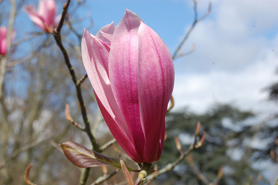 Цветы правильной формы по-настоящему большие, 25 сантиметров в диаметре. Оттенок бутонов варьируется от розового до красного. После цветения на ветках образуется плоды, они не съедобные, но выглядят красиво. По форме напоминают шишку. Магнолия украсит сад и привнесёт экзотики.