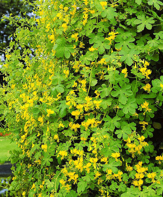 Семена настурции обыкновенной «Канарская лиана» (Tropaeolum majus Nanum) высевают в мае непосредственно на постоянное место в лунки по три штучки. При температуре почвы +18 градусов всходы появляются на 20-25 день. Для более раннего цветения можно выращивать культуру рассадным способом, высевая семена в горшочки в середине апреля.   Стебли растения достигают до 200 см длиной, светло-зеленые. Листья небольшие, пяти-семи раздельные. Цветки мелкие, канареечно-желтые с гофрированными лепестками и зелеными шпорцами. Настурция иноземная «Канарская лиана» прекрасно подходит  для вертикального озеленения сада, беседок, балконов.